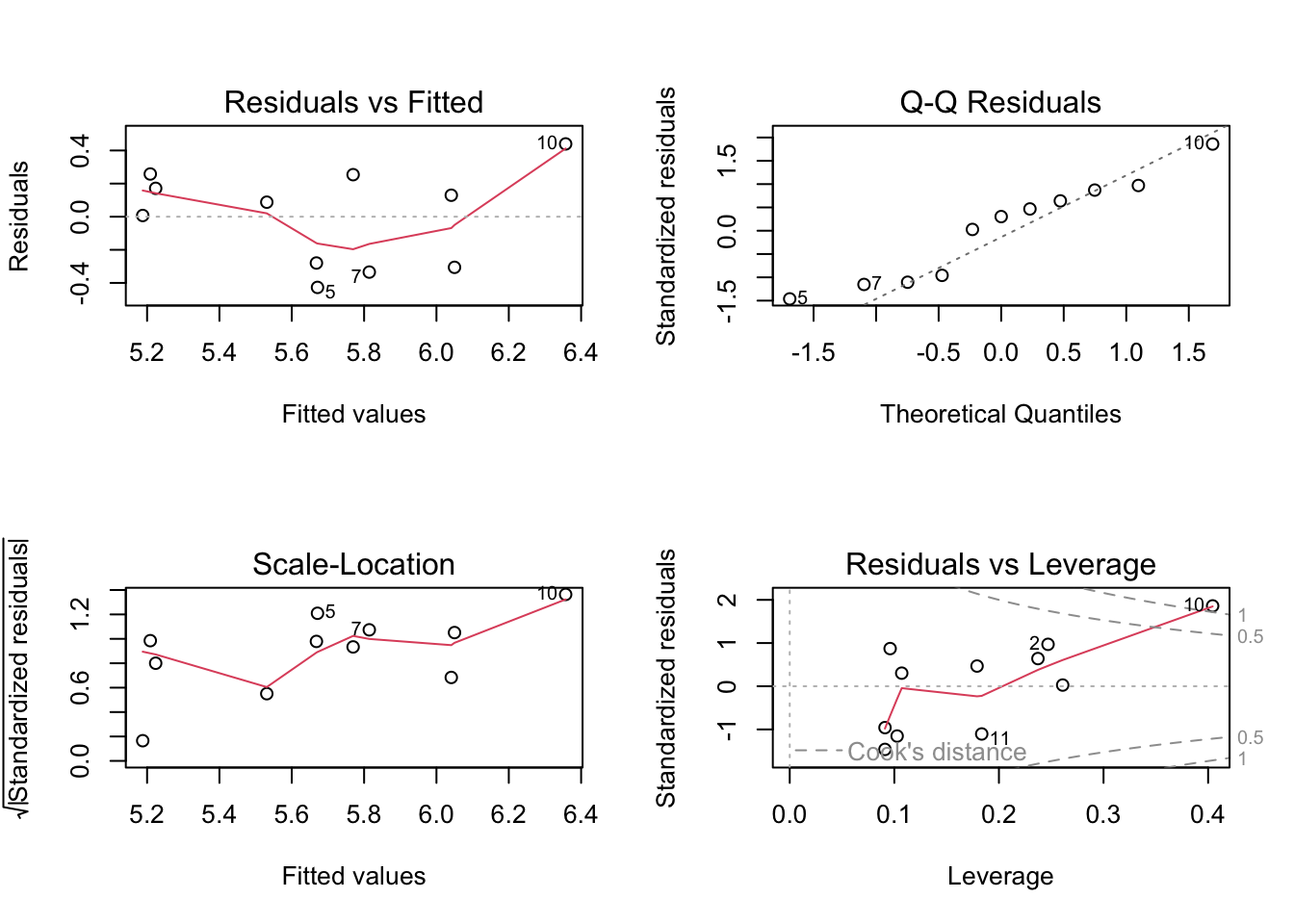 par(mfrow = c(2, 2)) # displaying diagnostic plots in 2x2 grid