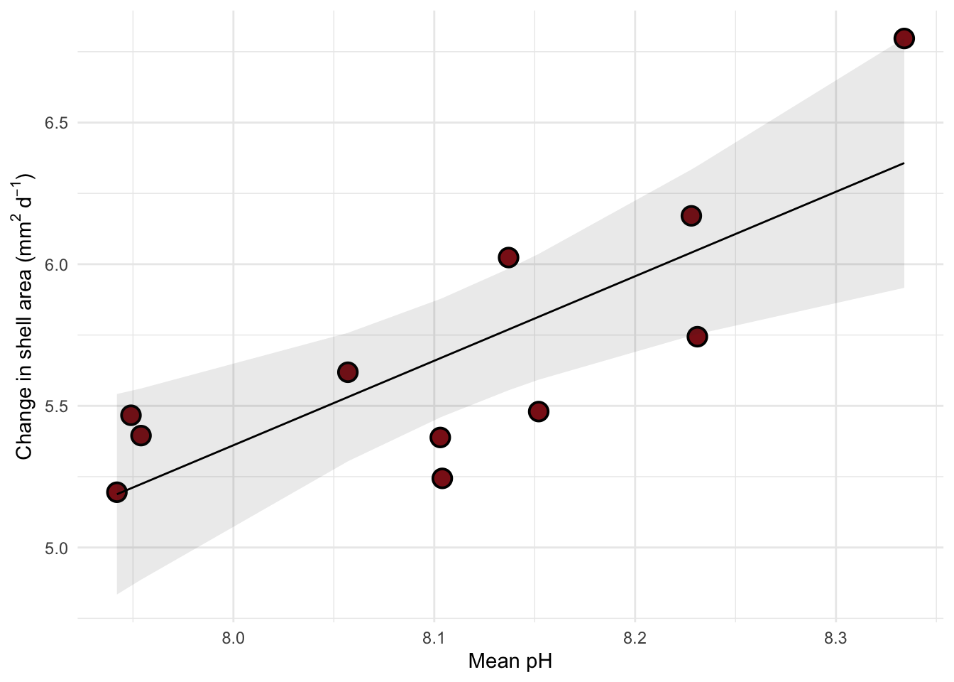 aes(x = mean_ph, # x-axis should be pH, y-axis should be change in shell area